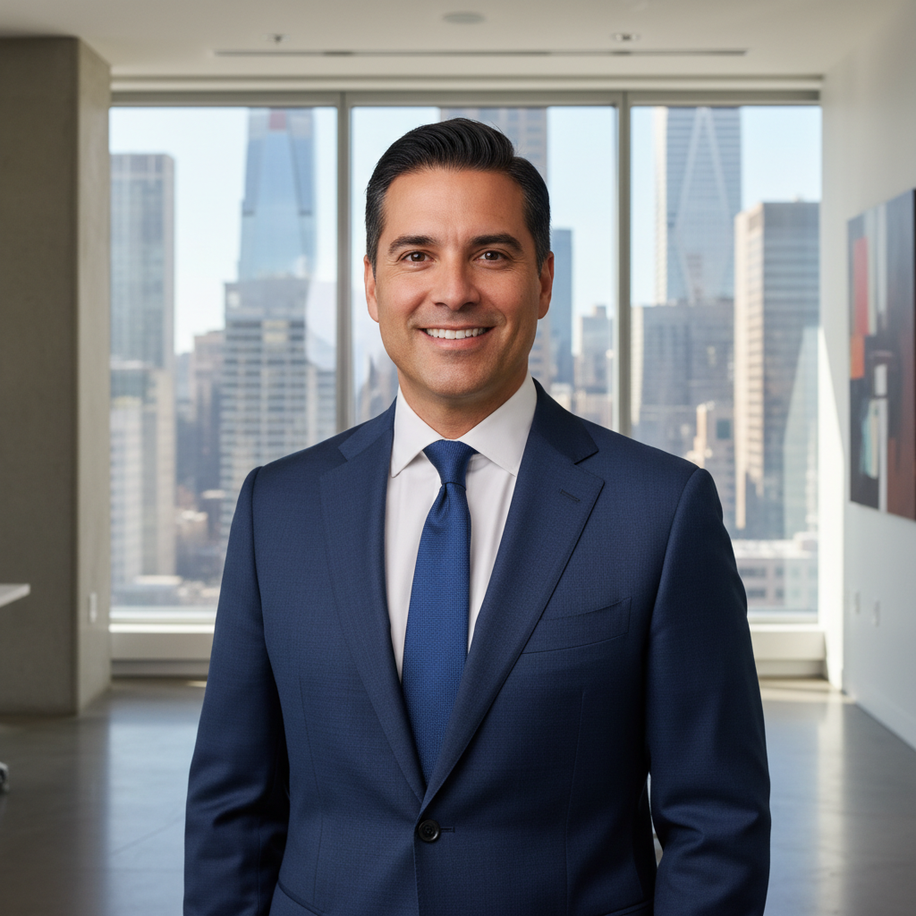 Hispanic male executive in charcoal suit with confident smile in corporate banking environment